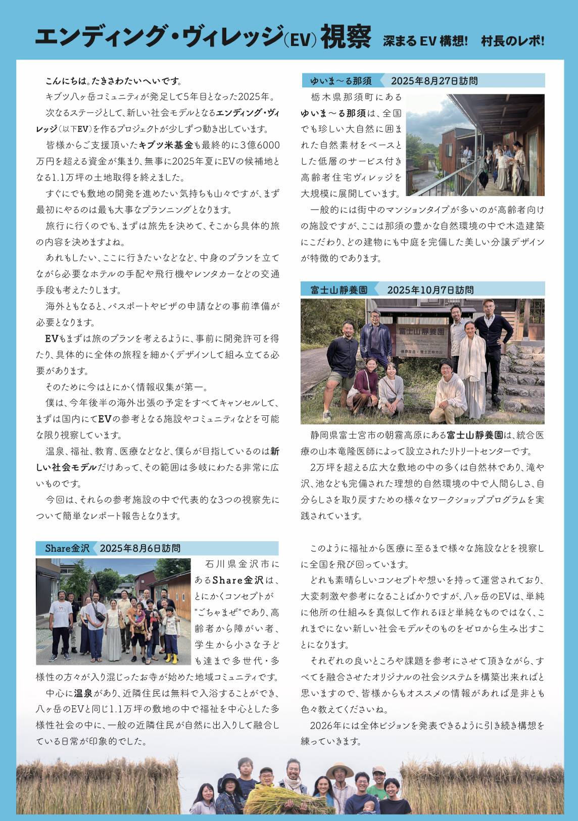 そんな未来のコミュニティが、八ヶ岳だけでなく、日本全国、世界各地に広がり、繋がり、協力し合うことで、国籍も国境、民族や宗教も超越した平和な地球人(アースリング)コミュニティとなることを目指していきます。