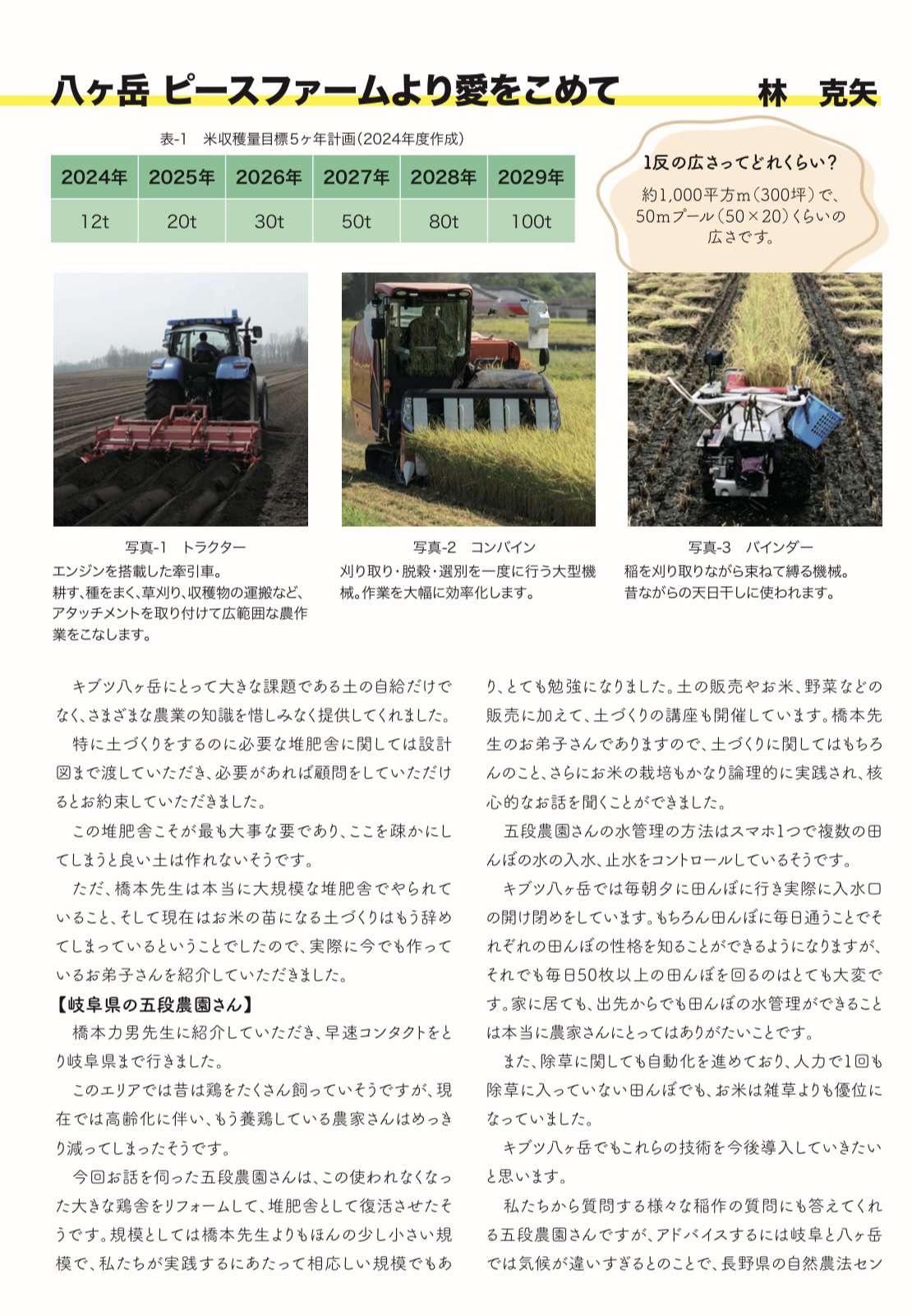 2023年度のキブツ八ヶ岳のお米の生産量は、10トンであり、300トンの生産体制や300トン分の備蓄体制までは、まだまだ先となるため、まずは30トンの生産量を確保できた時点から、この米交換の仕組みはスタート出来ればと思います。